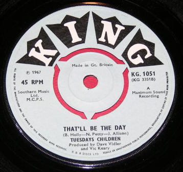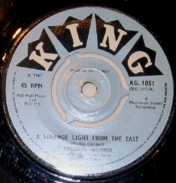 This was again recorded at Maximum Sound studio and was written by Phil Cordell This single was released on the King label KG1051 and was released in January 1967. The King label was owned by Rita King and it and its subsidary labels were more associated with ska and reggae music at the time. Tuesday's Children managed to get a front cover on the pop magazine 'Fab 208' as publicity for this single. (see Tuesday's Children archive page). B side was a reworking of the Buddy Holly song 'That'll be the day'. 'Strange Light From The East' only made the Radio London Fab Forty for 1 week, it made no. 37 on 29th January 1967.