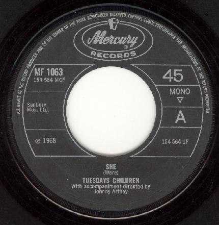 These two songs were recorded at the Chappel studio in New Bond Street, London, on the 3rd July 1968. By then Tuesday's Children were signed to Philips records and these two songs were released on the Mercury label, no. MF1063. 'Bright Eyed Apples' was originally going to be the A side but 'She' became the A side after it was featured in a short film '29' which starred Alexis Kanner who had been in the TV series 'Softly Softly' and 'The Prisoner'. The film ran for just 26 minutes and also starred Yootha Joyce, who was well known as a TV actress appearing in the comedy 'George & Mildred' amongst other shows. Tuesday's Children had a cameo appearance in the film in a scene in a nightclub, which was filmed at the London club 'Sybillas' on the 6th April 1968, the group receiving the princely sum of £45.00 for its appearance. When the film was released it played as the 'B' movie to cult film 'If', directed by Lindsay Anderson and starring Malcolm McDowell. 'She' was written and sung by Mick Ware who also did the orchestral arrangement with Bob Hodges. Johnny Arthey directed the orchestra on the session. 'Bright Eyed Apples' had been a hit for an English group called 'The Rokes' in Italy under the title of 'Mele Mature'. The original (which was written by Shel Shapiro and Roger Shepstone of the Rokes) featured a sitar which was a popular instrument at the time, mainly due to George Harrisons influence.