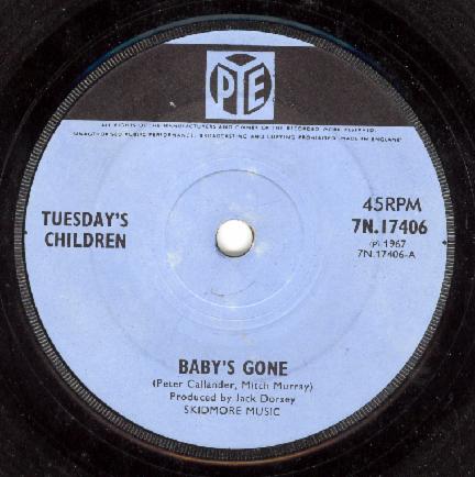 Phil Cordell quit Tuesday's Children in summer of 1967 and subsequently had solo hits as Springwater (I will return) and in Europe with 'Dan The Banjo Man' amongst others, he also had a single 'Red Lady ' released on Warner Brothers WB8001 in 1969. In August 1967 Bob Hodges (Hammond organ, ex Attack), Phil McKenzie (tenor sax, ex TNT, later Rod Stewart band) and Roger Davies (baritone sax) joined the reformed Tuesdays children. Trumpet player Hilary Roy also joined and did 4 gigs with the group in September 1967. 'Baby's Gone' was recorded at Abbey Road studios on 19th September 1967 and 3rd October 1967, the whole band played on the session plus some brass players from producer Jack Dorsey's band. Mick Ware sung the lead vocal and backing vocals were supplied by girl group the Paper Dolls. There is also a demo version of 'Baby's Gone' that has some brass on it but not the backing vocals. The song was written by Peter Callander and Mitch Murray and was released on the Pye lanel, no. 7N.17406. The B side was written by Mick Ware and was titled 'Guess I'm Losing You', this features the baritone sax of Roger Davies and the tenor sax of Phil McKenzie. 'Baby's Gone' was released on 10th November 1967.