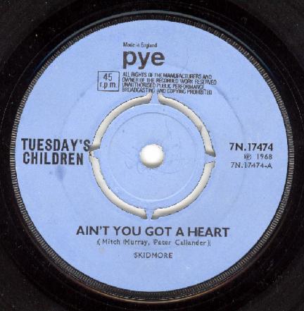 By December 1967 Tuesday's Children had become a 4 piece again with the departure of Roger Davies and Phil McKenzie. 'Ain't You Got a Heart' was another Murray/Callander song produced by Jack Dorsey with help from some of his brass players. It was recorded at Pye studios in London on 9th January 1968 and the B side 'In The Valley Of The Shadow Of Love' (written by Mick Ware) was recorded at the same studio on 12th January 1968. The B side also featured backing vocals by Paul Kendrick and Bob Hodges. The A and B sides were switched sometime after release but the long classical intro to 'In The Valley' did not make it very radio friendly.